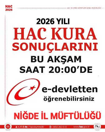 Diyanet İşleri Başkanlığı 15 Temmuz Milli İrade Şehit Ali Alıtkan konferans salonunda vatandaşlarımızın da katılımıyla, noter ve basın huzurunda gerçekleştirilen 2026 yılı hac kura sonuçlarınızı 05 Kasım 2025 Çarşamba günü (bu akşam) saat 20:00'den itibaren e-Devlet'ten öğrenebilirsiniz.